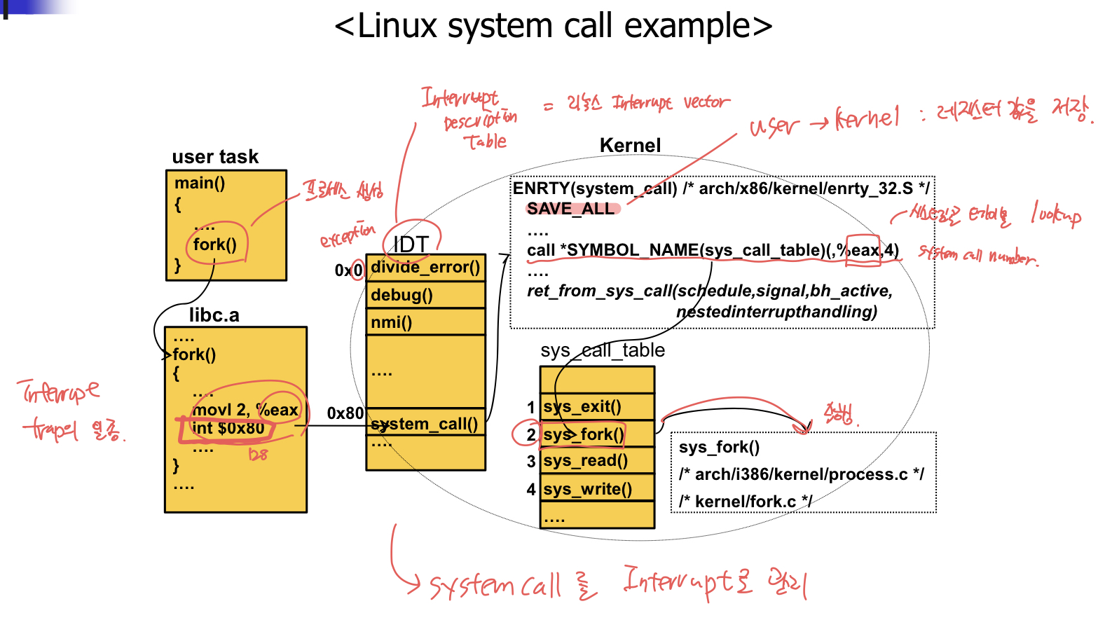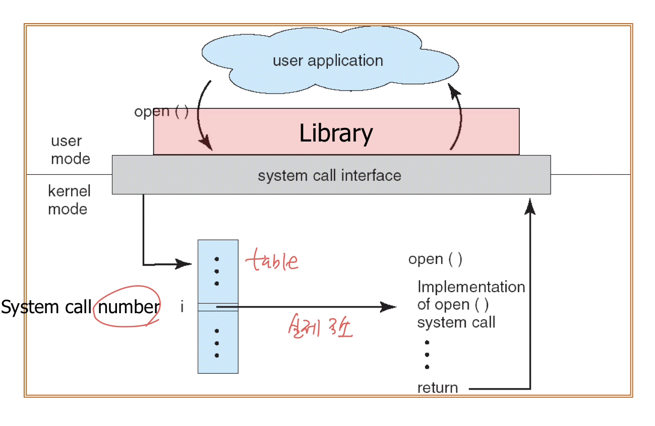 - Library 에서 system call을 요청 : kernel 모드 진입 - system call number - system call 수행되는 형식