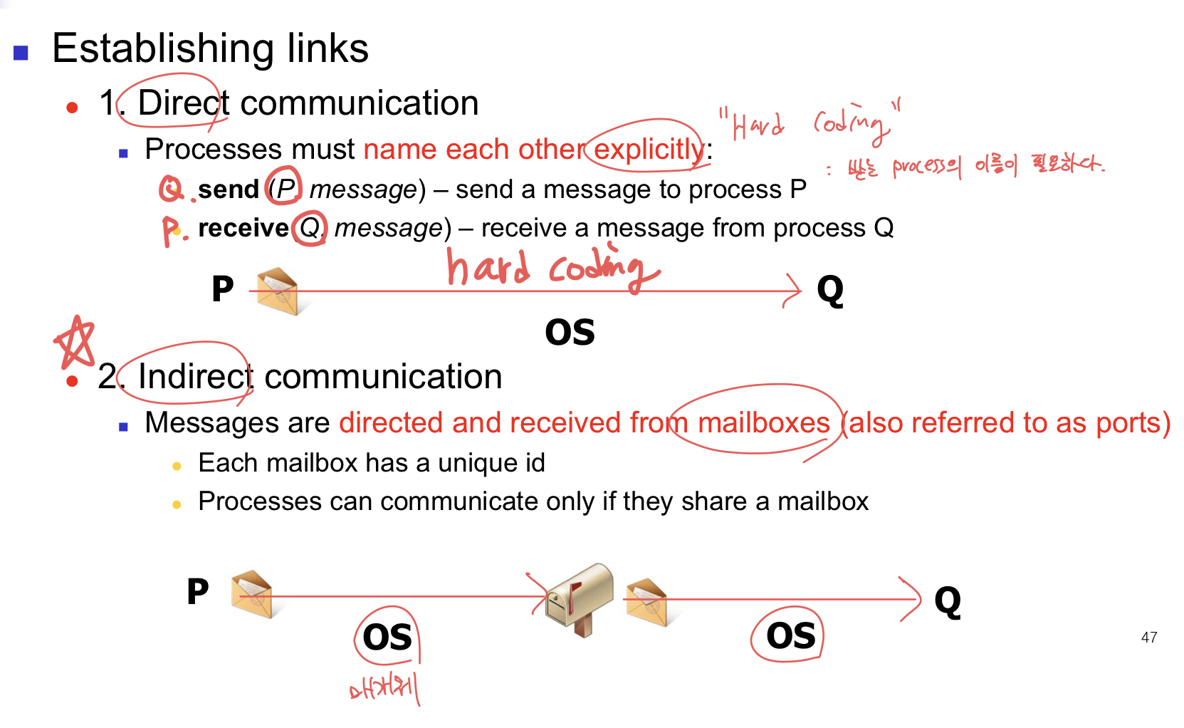 - 2. Indirent communitation : mailbox, 즉 shared memory를 통해 송수신