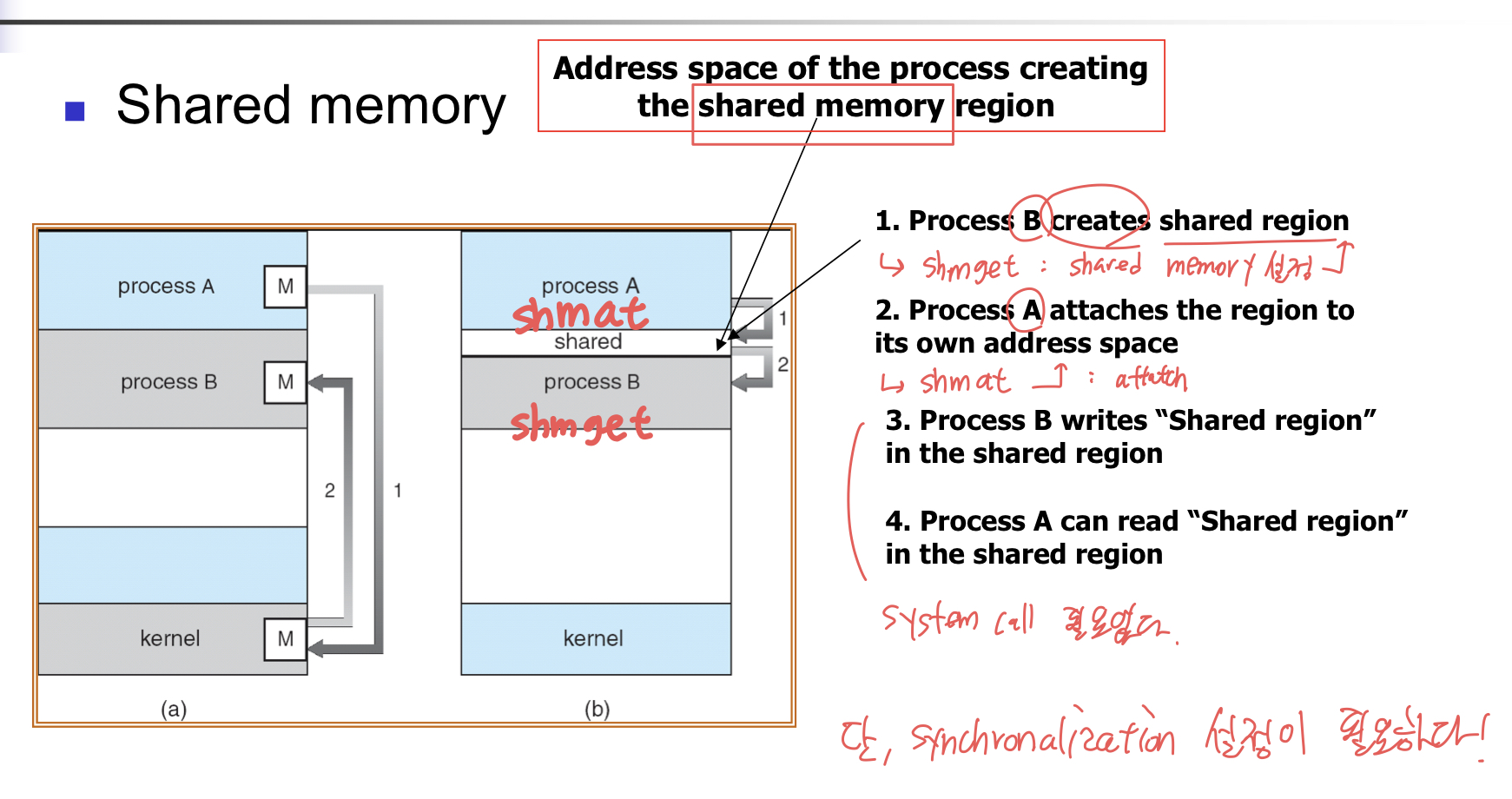 - 공유할 Process 내에서 할당시에만 system call : kernel의 도움이 필요하다