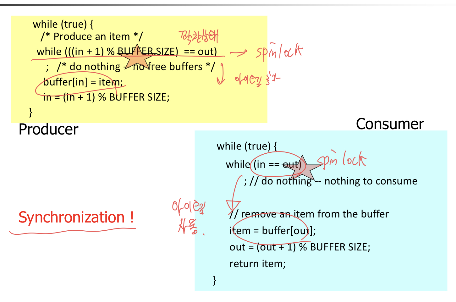 - Consumer : while(in == out) 즉 비어있는 경우에 Spin Lock 활성화