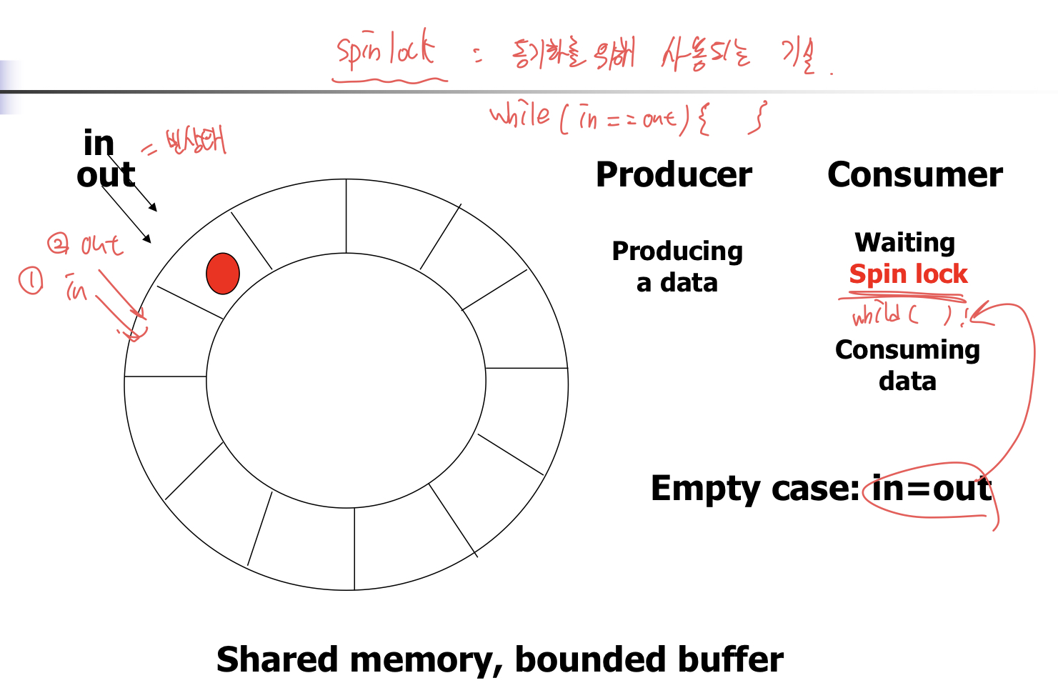 - Consumer : while(in == out) 즉 비어있는 경우에 Spin Lock 활성화