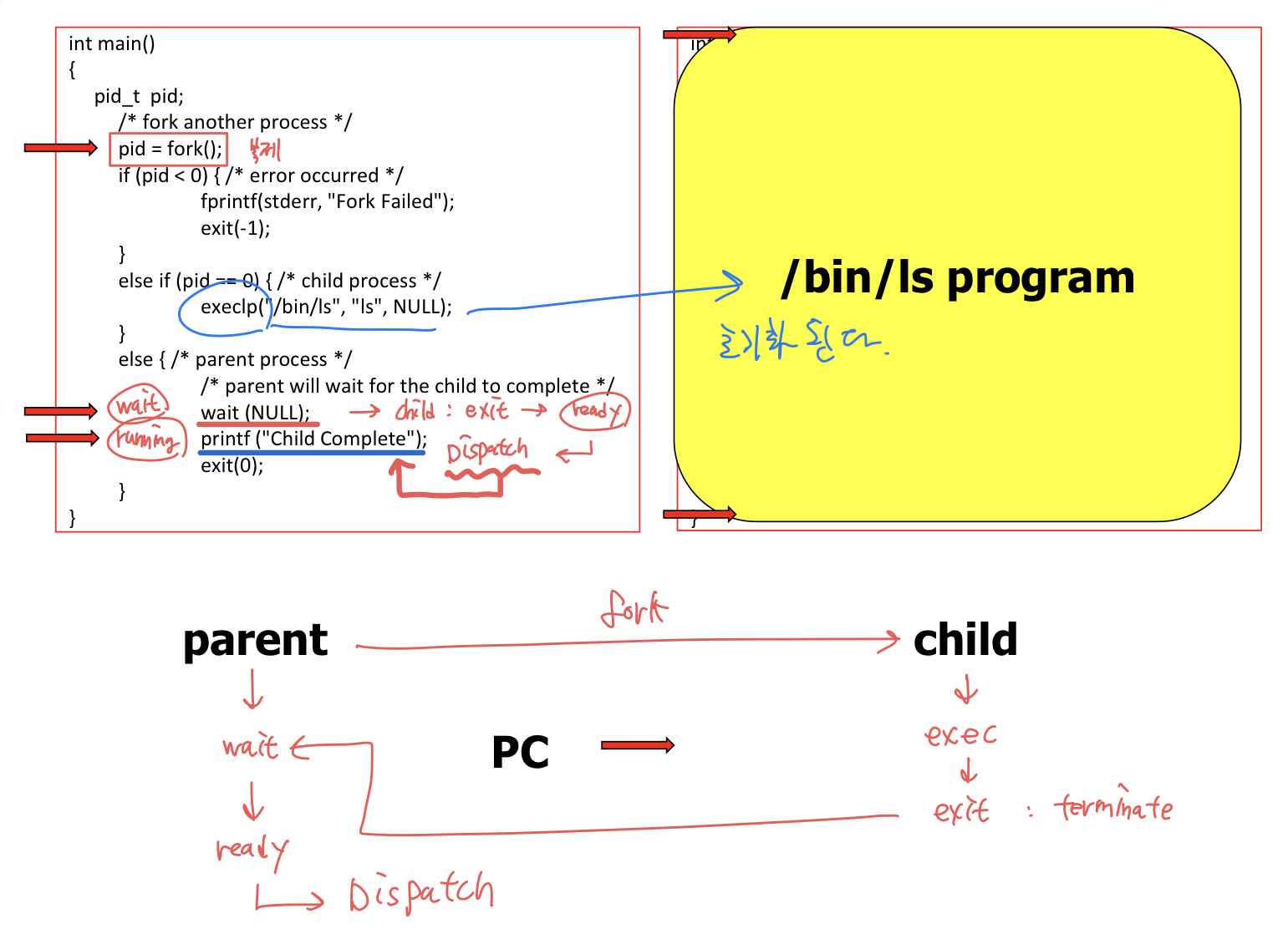 Parent : fork -- | wait ---------- | ready -- dispatch