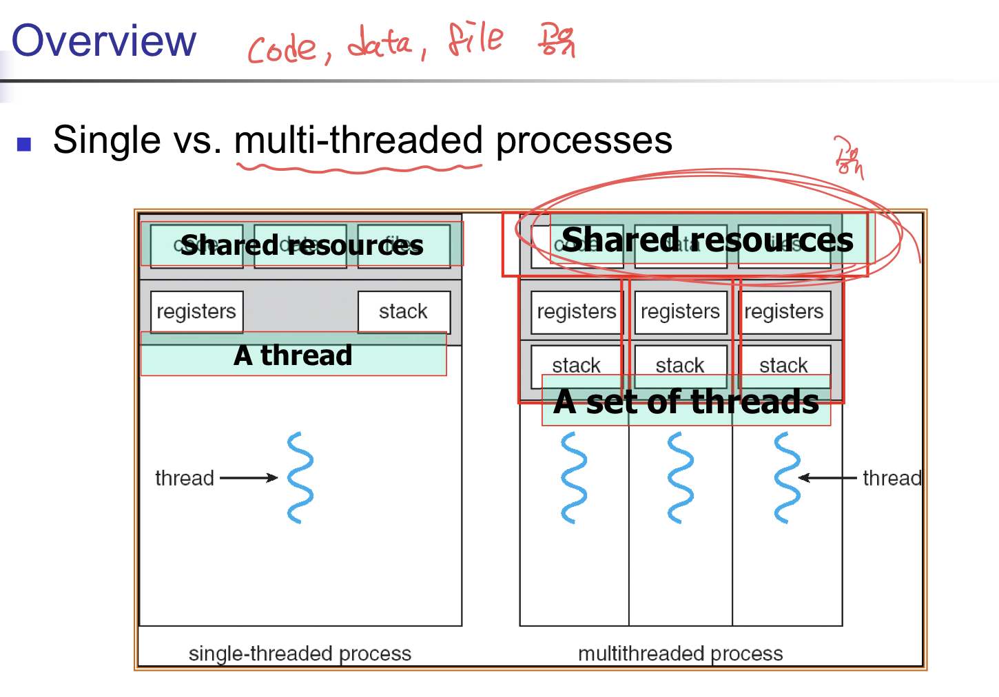 - 그러므로 공유 가능한 것들(code, data, file)을 공유하여 여러개의 thread로 사용